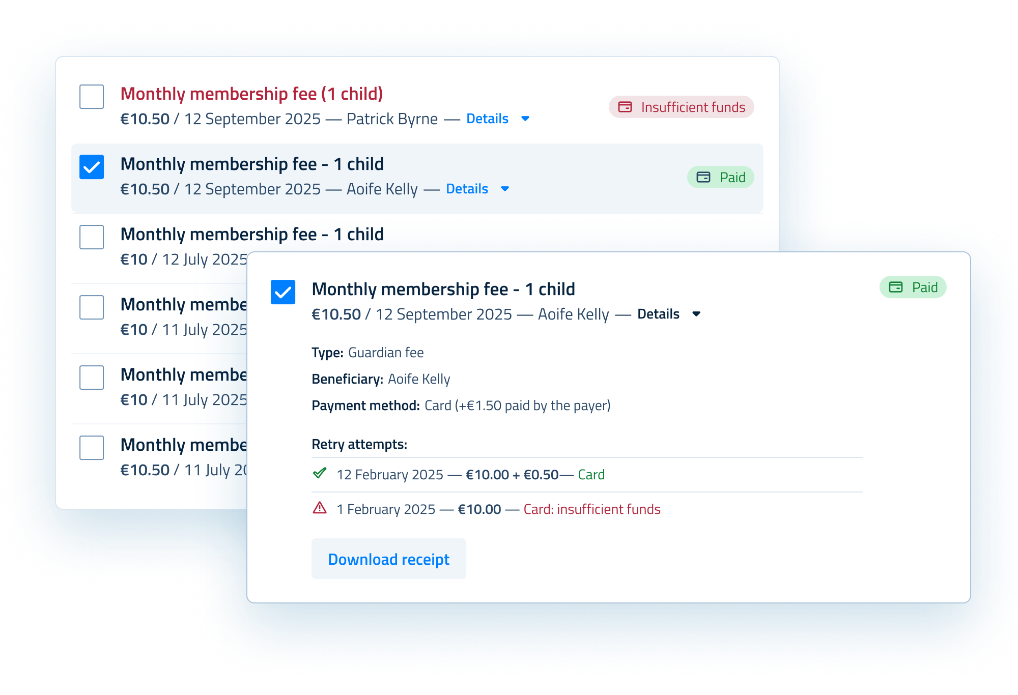 No more chasing unpaid fees: failed charges are detected and retried automatically.